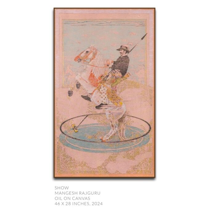 Mangesh Rajguru’s solo show carries a sharper voice and a richer sense of clarity. The colours stay bold and the figures feel playful, yet a steady unease moves beneath them. History walks into the present with ease and exposes the gap between what we claim and what we practise. Rajguru uses dry humour to point